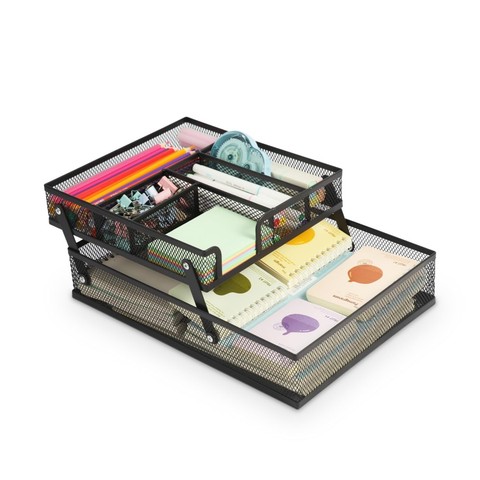 โต๊ะพับลิ้นชักจัดของจัดระเบียบ2ชั้นถาดเก็บเอกสารตาข่ายสีดำขยายได้